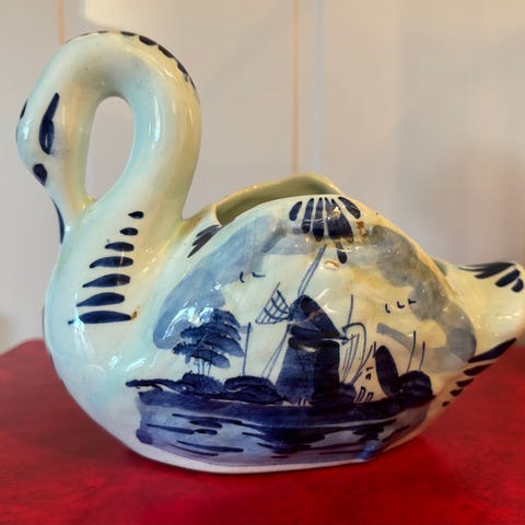 Unik lysestake / dufte lampe i porselen selges. Den er formet som en hval eller fisk, i kobolt blå med Delft-stil og med blomstermotiv. Lengde 28, bredde 16 cm. Den er pent brukt og framstår som ny.