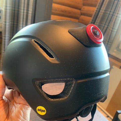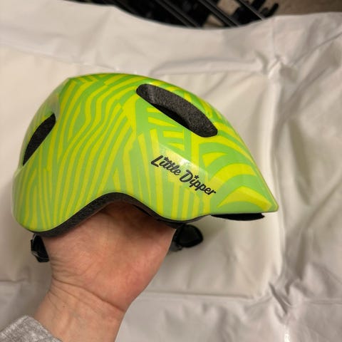Den er aldri brukt. Vi kjøpte den på tur da vi trodde vi hadde glemt sønnen vår sin hjelm. Da vi kom frem til hytten, oppdaget vi at vi ikke hadde glemt hjelmen likevel. :)