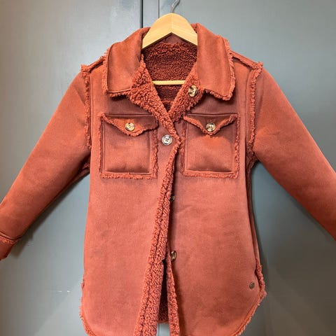 POMPdeLUX barn jakke i størrelse 134 for jenter. Jakken er burgunderrød/rust og har et mykt, plysjfor på innsiden. Den har knappelukking foran og to brystlommer med knapp. Materialet gir god isolasjon og er egnet for kjøligere vær. Kan brukes på begge sider