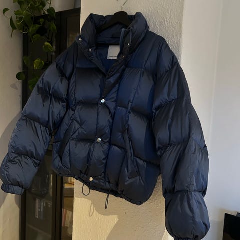 Ganni jakke i blå farge, størrelse 38 (M)for kvinner. Jakken har hette og glidelås foran. Materialet gir isolasjon og varme, egnet for utendørs bruk i kaldt vær.