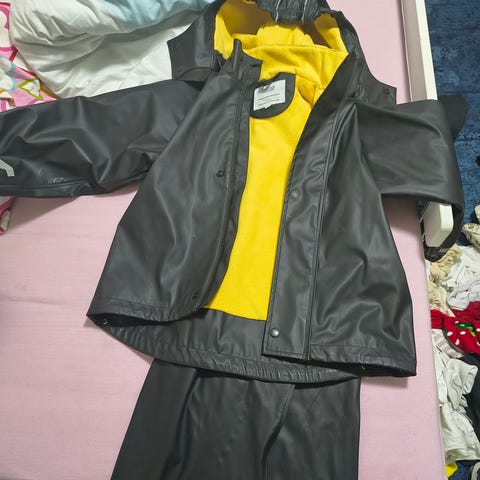 Pent brukt regnsett. Avtakbar hette. Høy bukse med seler.