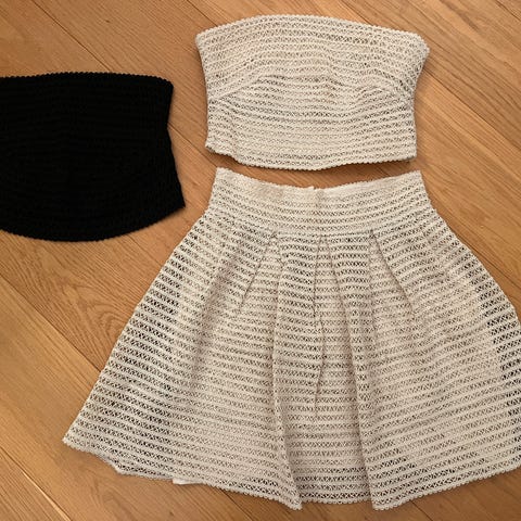 Knelangt skjørt med drapering. Kombinert stoff og blonder