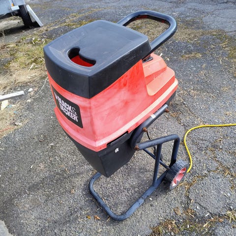 Ikke oppgitt Hagekompostkvern i rød plast med svart håndtak og hjul for enkel transport. Utstyrt med kontrollknapper på toppen for start, stopp og sikkerhet. Designet for å kværne hageavfall og kompostmaterialer. Kompakt og bærbar med støtteben for stabilitet under bruk.