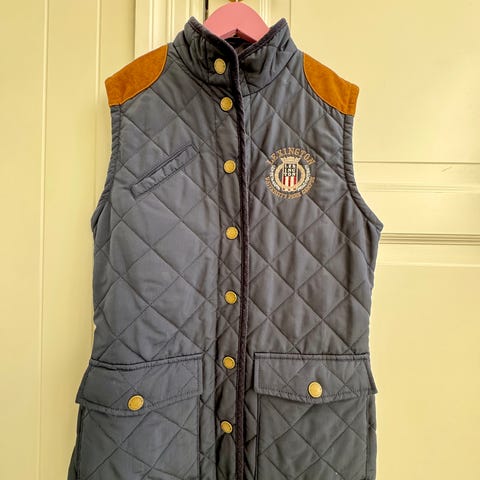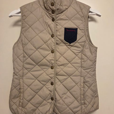 Det er cord i halsen, brun semsket skinn på skuldre, flere lommer og strikk i livet som gir et feminint utseende.