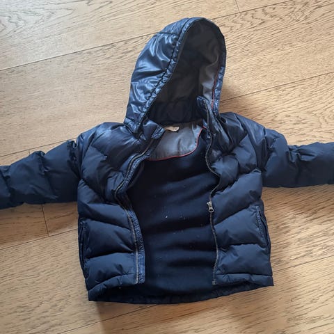 Arket barnejakke i størrelse 110/ 116, designet for gutter. Jakken er blå og har quiltet mønster. Den har glidelås foran og ribbestrikket krage. Jakken er isolert for å gi varme.