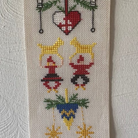 Flott, gammelt brodert julebilde med oppheng på messingstang.