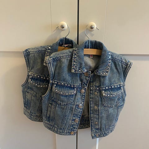 Levi's Denim Vest i blå farge, størrelse L for kvinner. Laget av 100% bomull. Vest har knappelukking foran og justerbar snøring bak for tilpasning. Designet for casual bruk.