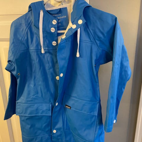 Selger en flott marineblå pyttpytt regnjakke med knapper størrelse seks år. Ikke mye brukt. Fine detaljer med knapper. Veldig mye bruk igjen.