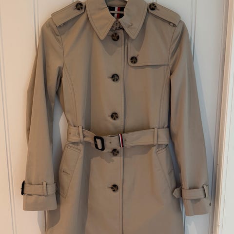 Tommy Hilfiger trenchcoat i beige farge. Kåpen har belte i livet og detaljer på ermene. Passer en normal str S.