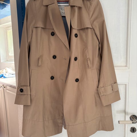 Tommy Hilfiger trenchcoat i beige farge. Kåpen har belte i livet og detaljer på ermene. Passer en normal str S.