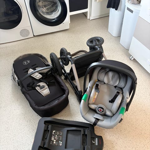 Besafe bilstol med base og adapter så bilstolen kan settes på underdelen på vogna. Ikke utsatt for noe støt eller kollisjon. Selges samlet.