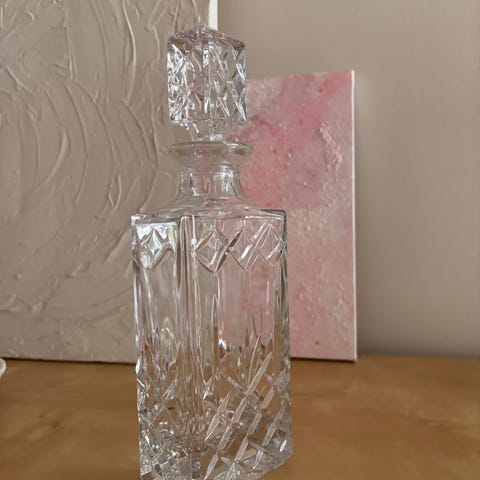 Liten krystall karaffel en liten skade på innsiden av korken, men synes ikke. Fin å servere dessertvin i.