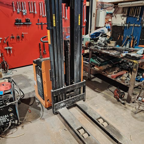 Elektrisk pallestabler med kapasitet på 2000 kg. Utstyrt med røde og svarte farger, laget for håndtering og transport av paller. Batteridrevet enhet med digitalt display og kontrollpanel. Egnet for bruk i lager og industrimiljøer.Følger med bateri og lader