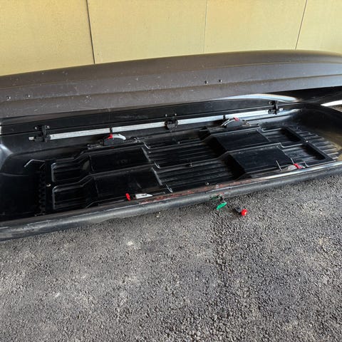 Packline takboks montert på Volvo takholder. Takboksen er svart og egnet for ekstra lagringsplass på taket av bilen. Passer til bruk med Volvo takstativ for sikker montering.