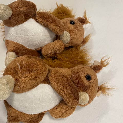 To små, plysjfigurer som ser ut som elgkalver eller reinsdyrkalver med gule horn.