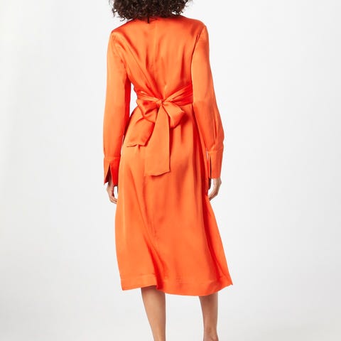 Lindex skjortekjole i rød farge, størrelse M. Midi-modell med avslappet passform, stor i str , lengde 127 cm. Kjolen har krage, lange ermer og knappelukking foran. Materialet består av 63 % resirkulert polyester og 30 % økologisk bomull. Uforet design., den er vasket en gang