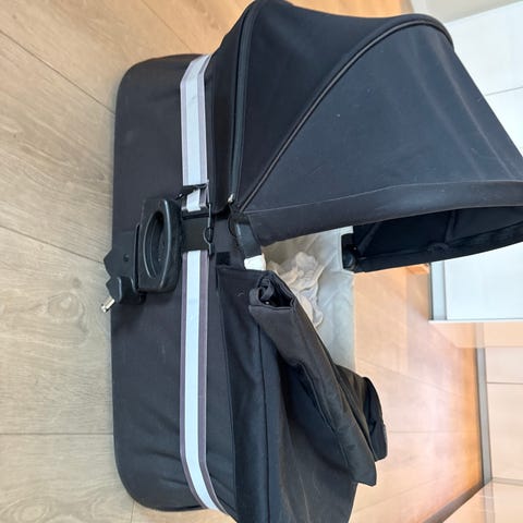 Baby Jogger barnevognsbag med rød hette og grå base. Inkluderer en hvit polstret madrass og innvendig foring. Passer til city mini gt. Må hentes
