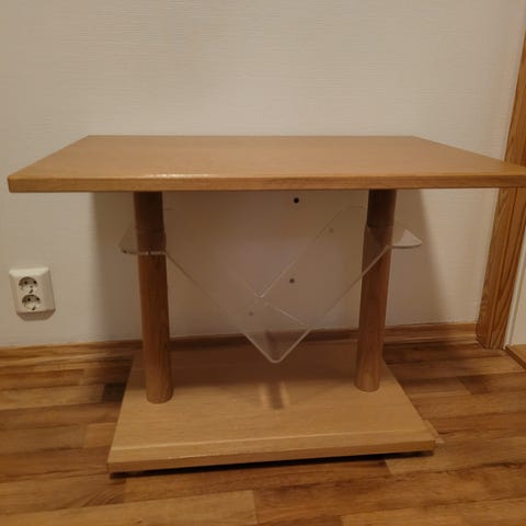 Prydelig sylinderformet sidebord, laget av solide eikestaver og en solid kantlist, topplate av valnøttbeiset finér.