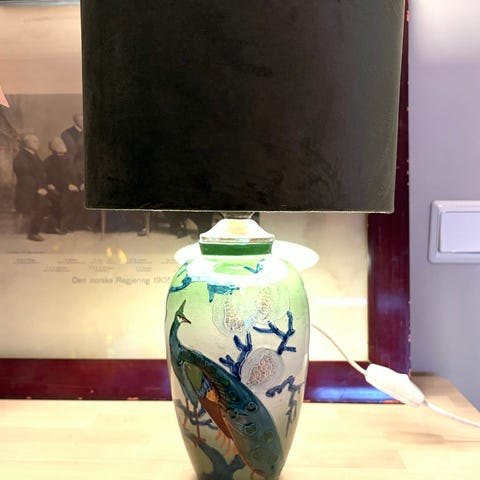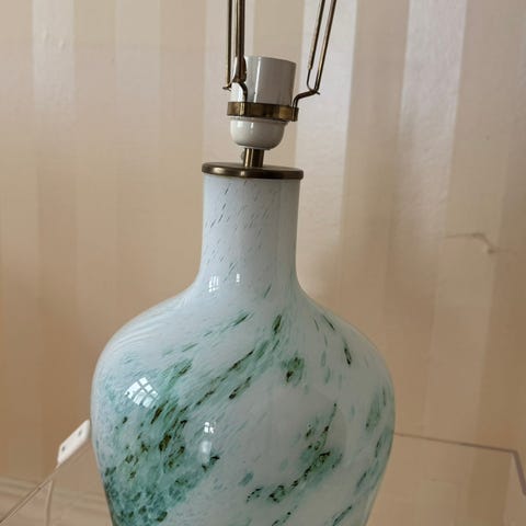 Stor bordlampe i kunstglass med messingstang for lysholder fra 1980 tallet