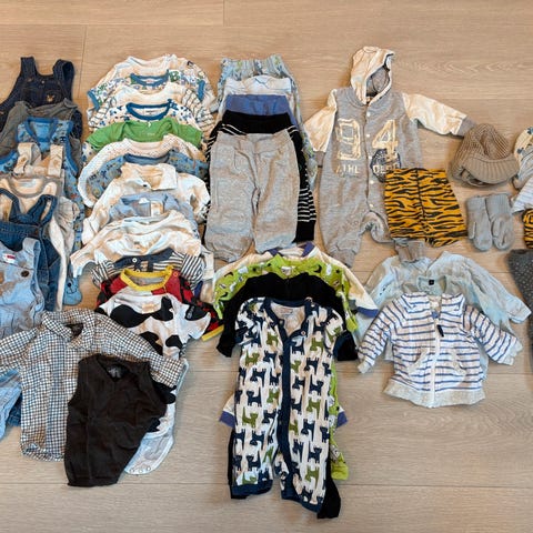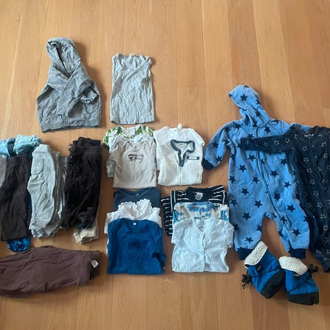 Klespakke til gutt i str 50 og 56. I tillegg et fleeceteppe og sko i str 12. Alt pent brukt, i god stand.