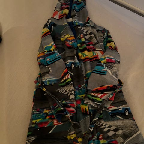 H&M morgenkåpe i størrelse 122, designet for unisex bruk. Badekåpen har en grønn farge med mønster, hette med øyne og tenner, og belte for justering. Laget av mykt og absorberende materiale, egnet for bruk etter bading eller dusj.