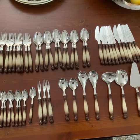 Duchess Amadeus porselen i hvitt, blått og gull detaljert mønster. Servise er veldig pent og svært lite brukt, jeg finner ingen slitasje hverken i porselenet eller i fargen på servise. Servise selges samlet.