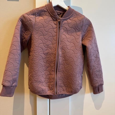 Pent og lite brukt termojakke fra Wheat. Str 128. Dus lilla med gullprikker. Ingen flekker eller hull. Den til å dra opp glidelåsen har mistet litt av fargen. Og et par skraper på refleksen bak. Har ikke noe å si for bruken.