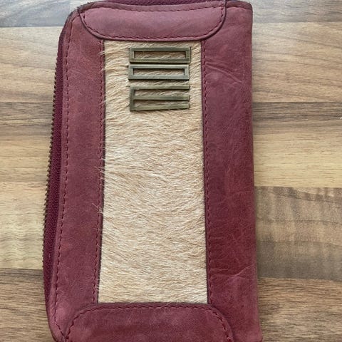 Skulderveske i lær (ekte skinn) for dame. Kan brukes som clutch, da skulder reimene kan hektes av. Skulder reimen er ikke justerbar. Kjøpt i Oslo.