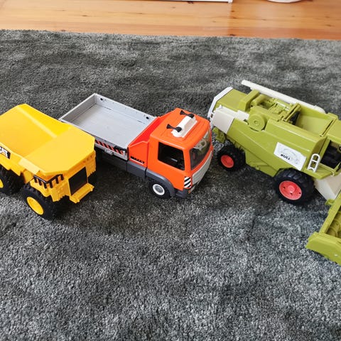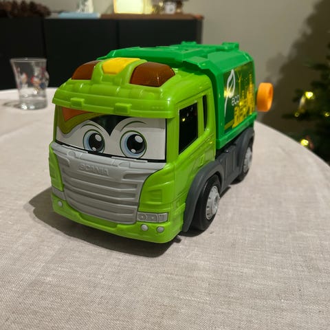 Liten dumper selges. Kan trykke på hjelmen så snurrer ansiktet til et annet. Plass til litt last på planet.