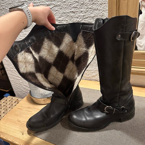 Støvlettene har stått lagret i skap noen år. I sin tid var det ett svært godt merke. Jeg skriver var for jeg tror de gikk konkurs en gang🤔. Selv har jeg brukt dem en gang. Pga hovne føtter så ble det med det. De kostet en del husker jeg. Men prisen kan diskuteres. Jeg kan frakte dem mellom Risør og krsand. Ellers må de hentes.