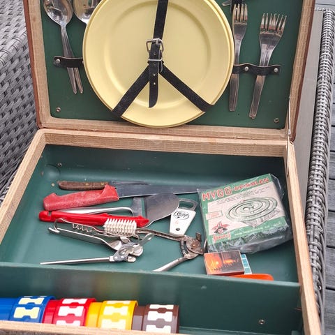 Ny og fin, ubrukt vintage/retro koffert med 4 krus, 1 termos, 4 teskjeer, vin åpner, 4 spiseskjeer, 4 gafler, 4 spisekniver, 2 duker, 1 teppe, 1 krydder boks, 4 middag tallerkener,