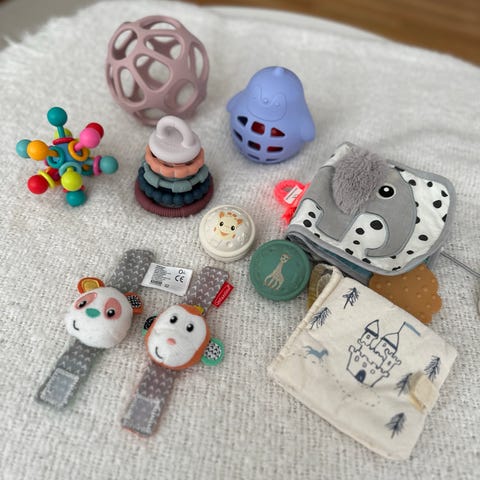 Selger en liten pakke med forskjellige baby/småbarnsleker.