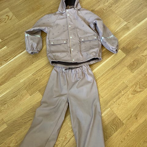 Hampton Republikk regnjakke og vossatassar regnbukse str. 110-116 noe slitasje men ingen hull på bukse mangle begge fottstrikk se på nærhet bilder, men veldig fint og mye brukt igjen 🌸