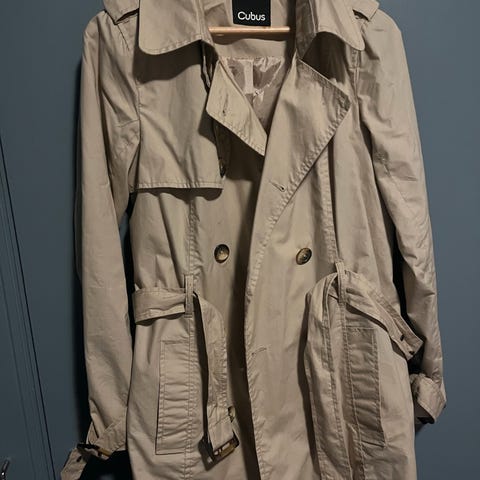 Kakifarget jakke med fine detaljer selges. Knappelukking med store knapper og justerbart belte, samt fremme på ermet. Passer fint til både kjole og bukse. Sjekk gjerne mine andre annonser også, kan evt. sende samlet 😊👍