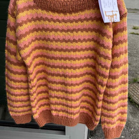 Fin strikket genser, ca størrelse 6 år. Usikker på hvilken garntype som er brukt, klør litt. Pent brukt.