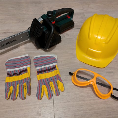 Verktøykasse m.tilbehør og motorsag for barn