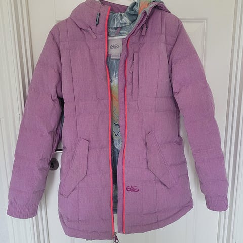 Moods of Norway Annet yttertøy i grå farge, størrelse 38 for kvinner. Jakken har hette, glidelåslommer med gulldetaljer og en innvendig rosa mønstret fôr. Yttertøyet er designet for utendørs bruk og har dekorative broderier på brystet og ermet.