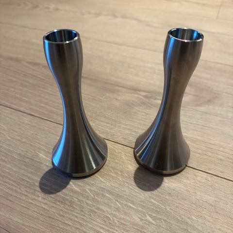 To stk høge lysestaker. Pent brukt, men forekommer litt stearin. Har ikke forsøkt å fjerne dette.