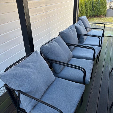 Sittegruppe med bord fra Bohus, merket heter Sindig. Oppbevart under tak, så ingen synlige merker. Putene er oppbevart inne. Utgått møbel, nypris for en stol: 3799,-