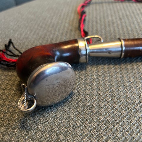 Manuell kaffekvern med base i tre og kvern i messing. Utstyrt med sveiv for håndmaling av kaffebønner. Har en liten skuff under for oppsamling av malt kaffe.