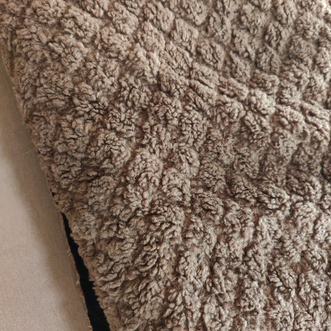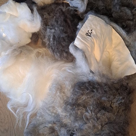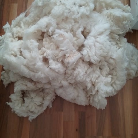 To poser med sauskinnsrester a 500 gram. Farge creme, kortklipt og krøllete, lengde ca 18 mm. Opprinnelsesland Australia.