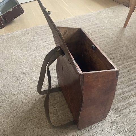 Her er en hjemmelaget (?) ryggsekk i tre. Finer løs på baksiden. Har vært fint på fronten også men den er fjernet. B 42 cm. H 50 cm. Denne kan brukes til mange formål. Litt godt drikke på et marked? Eller annen nytte eller pynt. Kr 200,-