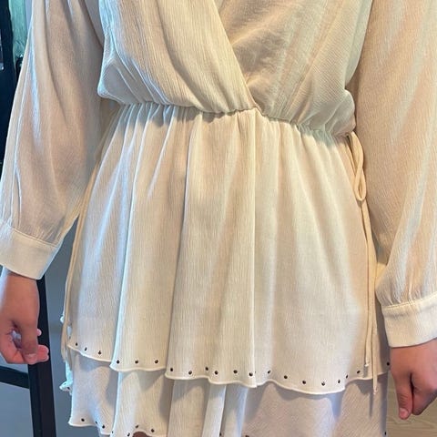 Kjolen har et mønster med strukturert stoff og langermet design. Den har en omslagsstil med knyting i siden, og stoffet har en lett og delikat tekstur.