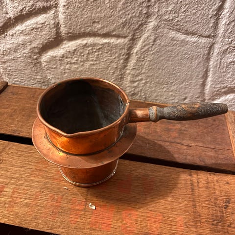 Flott eldre kanne/mugge i kobber og kraftige støpejerns fester/håndtak ol-flott stand
