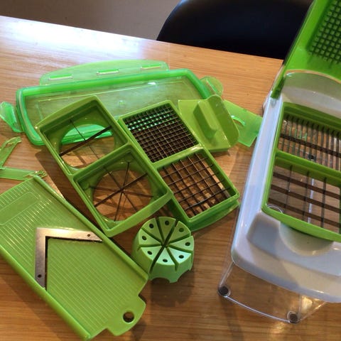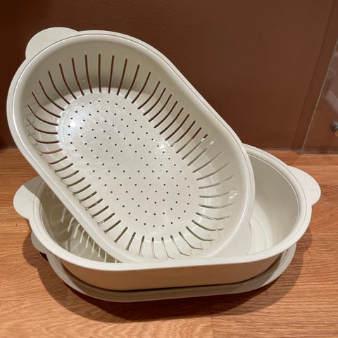 6-delers sett med plastikkfrukt- og grønnsakskurver for kjøkkenbruk.