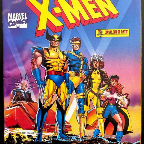 Marvel X-Men samlekort med fargerikt design og illustrasjoner av karakterer fra X-Men-serien. Kortet viser flere X-Men-figurer samlet rundt et stort X-symbol. Passer for samlere og fans av Marvel og X-Men.
