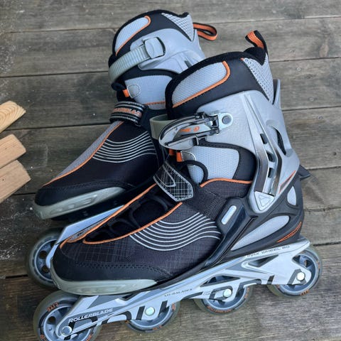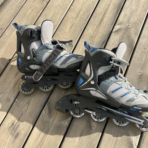 Rollerblade Rulleskøyter i størrelse 40, farge svart og grå. Egnet for rulleskøyting. Skøytene har fire hjul og snøring med borrelås for justering og støtte.
