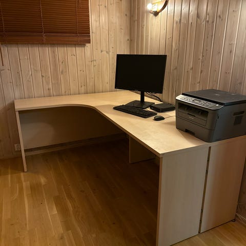 Hjørneskrivebord med to separate skuffeseksjoner med kodelås og hjul. Bordet har en stor skrivebordsflate i mørk farge, egnet for oppsett med flere skjermer og kontorutstyr. Passer for hjemme- eller kontorbruk, og gir god oppbevaringsplass og arbeidsområde. Høyden på skrivebordet kan justeres. Brukt veldig pent, ingen synlige skader eller bruksmerker.