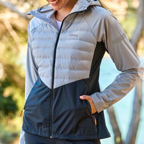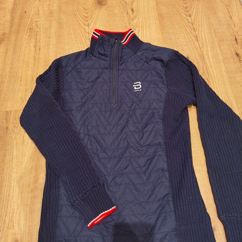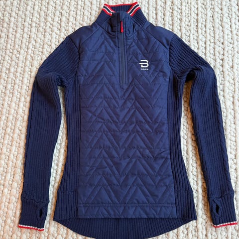 Björn Dæhlie Half zip ullgenser med rød quiltet front og hvite strikkede ermer. Laget for damebruk, kombinerer materialer for både isolasjon og bevegelsesfrihet. Str XL