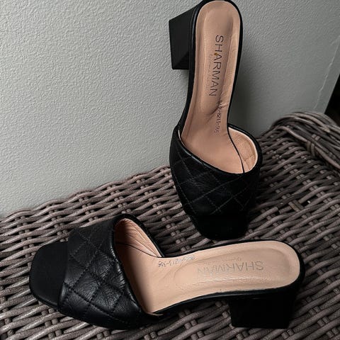 Behagelige Calvin Klein hæler i størrelse 38. Skoene er laget av svart semsket skinn med dekorativ metallspenne foran. Hælene er høye og solide med gummisåle for bedre grep. Passer til formelle anledninger eller kontorbruk.